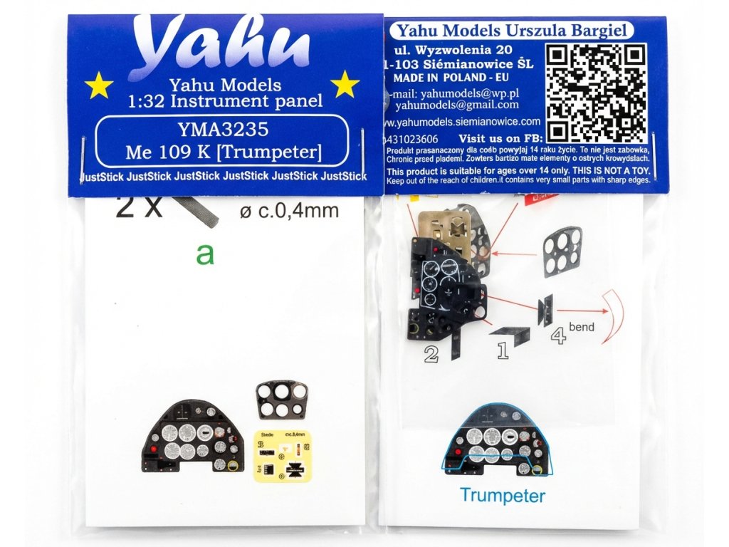 The 1:32 scale Yahu Models kit features photoetched dashboards designed specifically for the Trumpeter Messerschmitt Bf-109K-4 kit. The main advantage is the JustStick technology - the parts are already colour-printed and self-adhesive coated, so they can be directly glued to a designated location in the cockpit without the need for painting, laminating or glue. This greatly simplifies the work and reduces the time needed to detail the interior. The colour scheme of the instruments matches the period originals and adds authenticity and visual depth to the model, especially when viewed in the open cockpit. The photo-etched parts are very thin and precise, allowing for a realistic appearance without the volumetric distortions typical of plastic alternatives.
