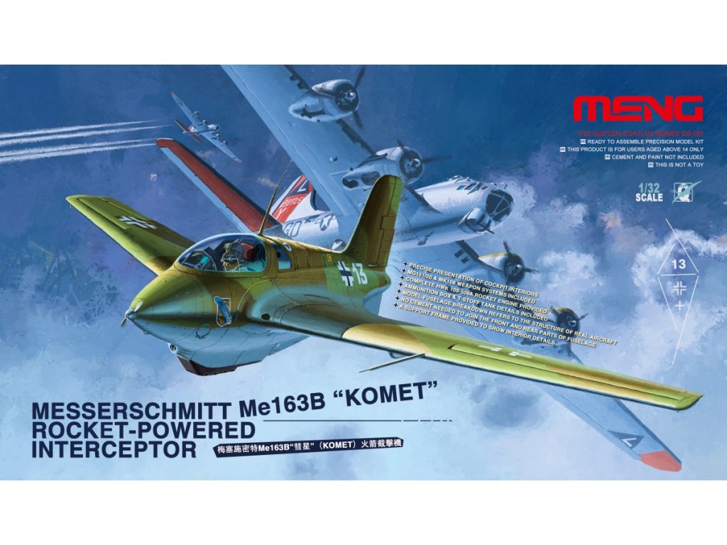 Meng 1/32 Messerschmitt Me 163B Komet is a plastic kit of German WWII missile fighter aircraft. This revolutionary but problematic machine was the only operationally deployed missile aircraft in the world and was primarily used to defend against Allied bombers.