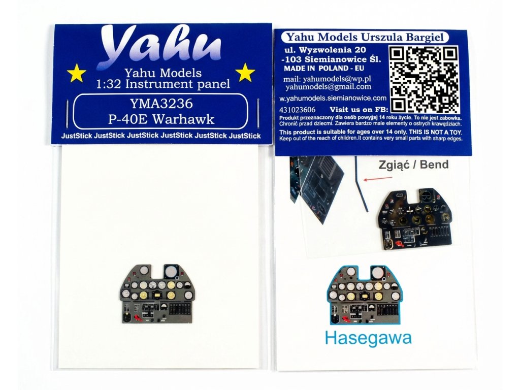 Yahu Models 1/32 P-40 E is a photo-etched 1:32 scale dashboard designed for Hasegawa Curtiss P-40E Kittyhawk/Warhawk kits. The board is colored and ready to be glued directly into the kit (JustStick technology). This add-on increases cockpit detail and replaces the plastic instrument panel from the original kit. The package does not contain paint or adhesives.