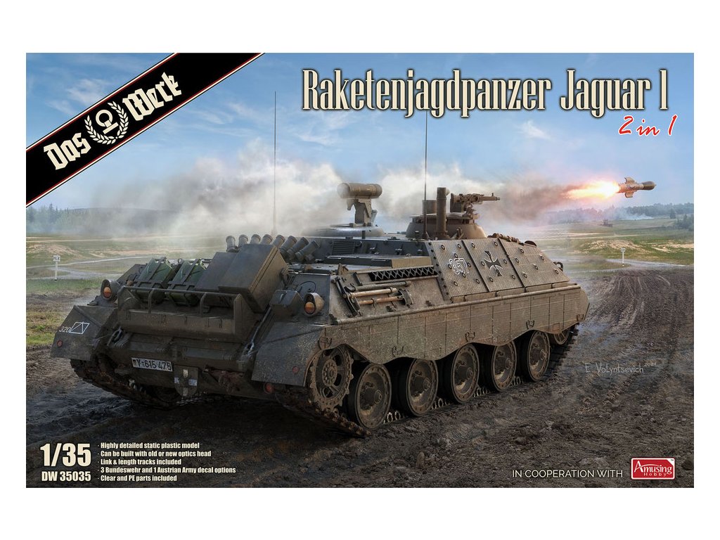 Das Werk 1/35 Raketenjagdpanzer Jaguar 1 (2 in 1) is a plastic kit of a German Cold War tank missile fighter, allowing you to build two different versions of the vehicle. The package does not include the paint or glue needed for assembly.