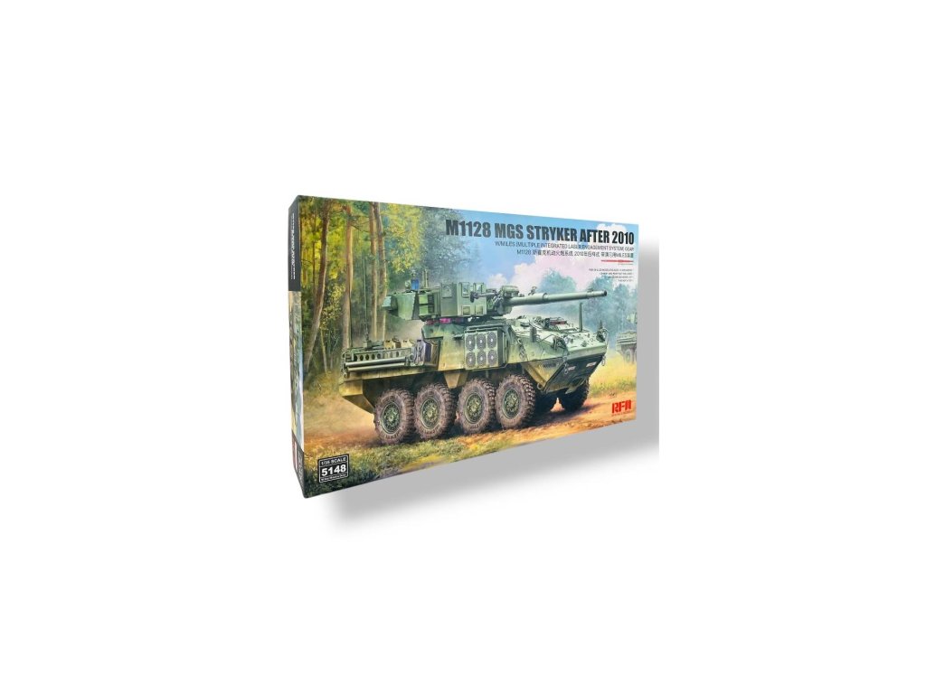 Rye Field Model 1/35 M1128 MGS Stryker After 2010 w/MILES is a diecast plastic model of an American wheeled fighting vehicle with gun turret. The kit depicts the post-2010 version equipped with MILES (Multiple Integrated Laser Engagement System) used for training. The 1:35 scale allows for a detailed treatment of modern equipment and is ideal for modelers interested in contemporary US Army military equipment. The package does not include the paint or adhesives needed for assembly.