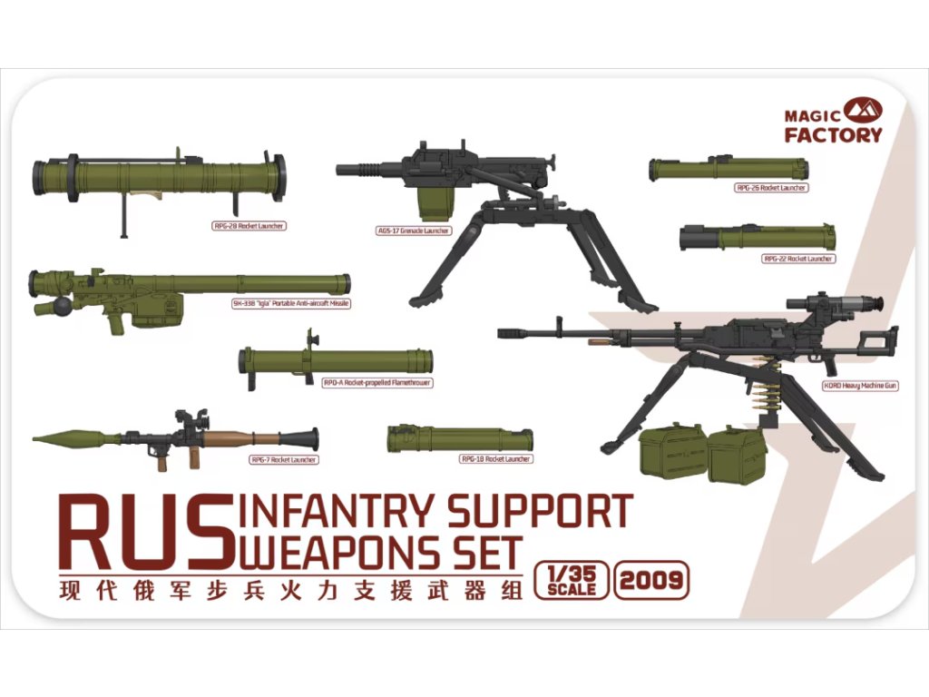 Magic Factory 1/35 Modern Russian Infantry Support Weapons Set brings you a detailed model set of modern Russian infantry support weapons. Includes realistic weapons and equipment suitable for dioramas. Package does not include paint or glue needed for assembly.