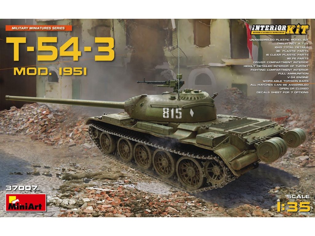 MiniArt's T-54-3 Mod. 1951 Interior Kit is a 1/35th scale model of an early 1950s Soviet medium tank with a fully rendered interior. The kit features detailed plastic parts including the engine compartment, turret interior and chassis. Package does not include paint or glue needed for assembly.