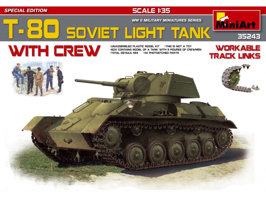 The T-80 Soviet Light Tank w/Crew 1/35th scale model by Miniart is a Soviet light tank from the beginning of World War II, including a crew figure set. The kit features detailed plastic parts including interior, armament and five realistic figures. Package does not include paint or glue needed for assembly.