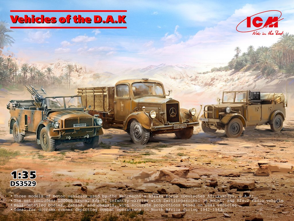 ICM 1/35 Vehicles of the D.A.K is a kit representing selected vehicles of the German Afrikakorps from World War II, including the Mercedes-Benz L3000 truck, the s.E.Pkw Kfz.70 off-road vehicle with a twin-bullet launcher, and the light liaison vehicle le.gl.Einheits-Pkw Kfz.2. The package does not include the paint or glue needed for assembly.