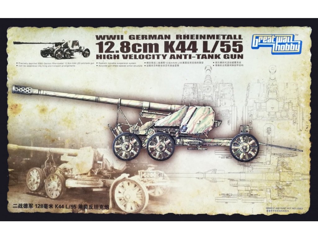 GWH's 1/35th scale model of the Rheinmetall 12,8cm K44 L/55 represents the German WWII high-speed anti-tank gun. The kit includes detailed plastic parts for the exterior and interior, including realistic elements such as the breech, the barrel and the sighting device. Also included are etched metal parts for fine detail and the ability to adjust the cannon to different positions. The package does not include the paint or adhesives needed for assembly.
