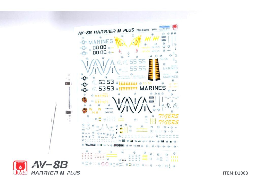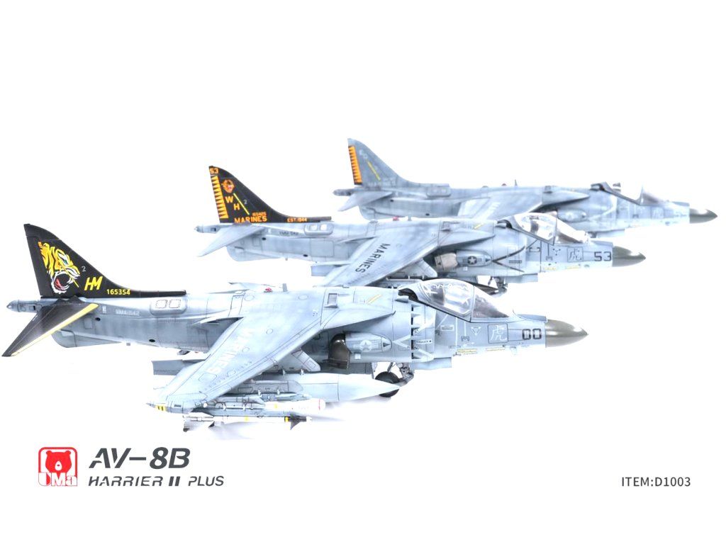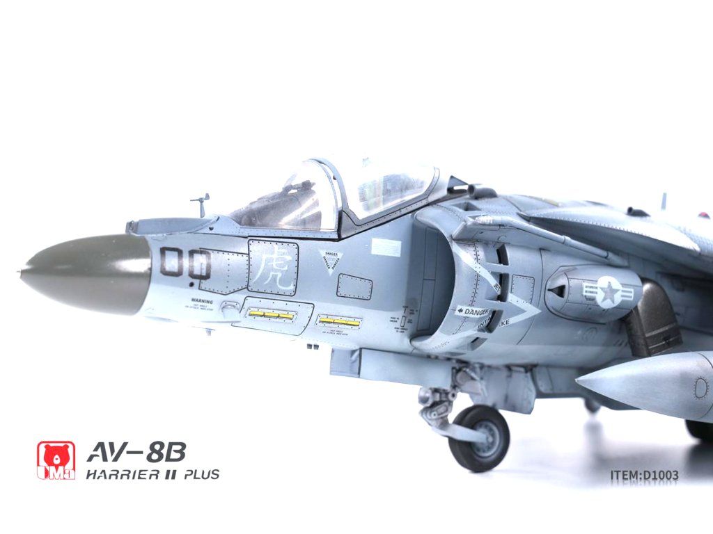 UMa Model 's 1/48 scale kit promises to be one of the best Harrier models on the market. The manufacturer has gone to great lengths to ensure precision craftsmanship and a detailed surface that includes finely engraved panel lines and rivets. The kit is newly designed and uses modern methods such as computer aided design and multi-part moulds, which is reflected in the high quality and detail of the parts.
