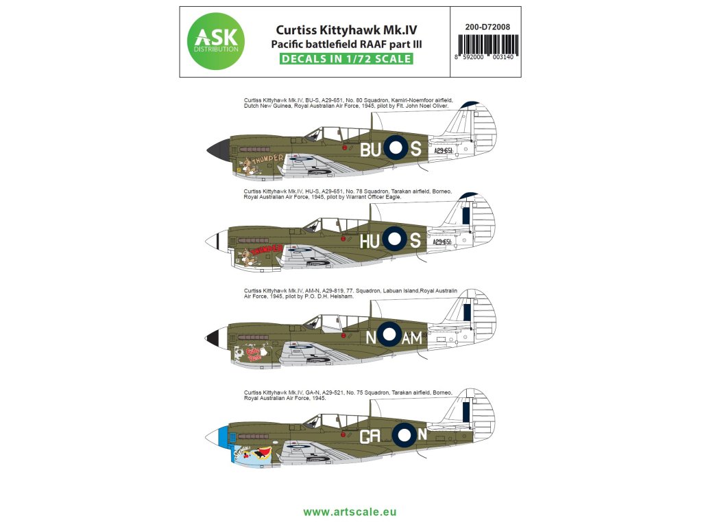 1/72 Curtiss Kittyhawk Mk.IV Pacific battlefield part III. Royal Australian Air Force 1945. (US: Curtiss P-40N). Contain 4 markings.