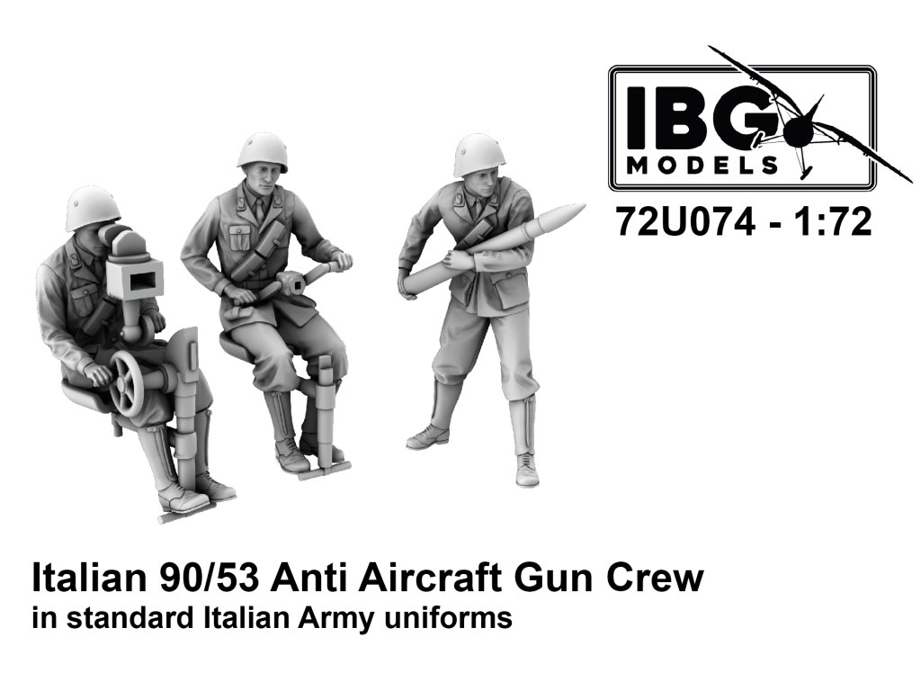 IBG's 1/72 scale figure set features a realistic rendering of the crew of the Italian Cannone da 90/53 anti-aircraft gun, deployed during World War II. The figures depict soldiers in typical field uniforms as worn by the Italian army during the deployment of this heavy gun, which was used not only against aircraft but also in an anti-tank role.