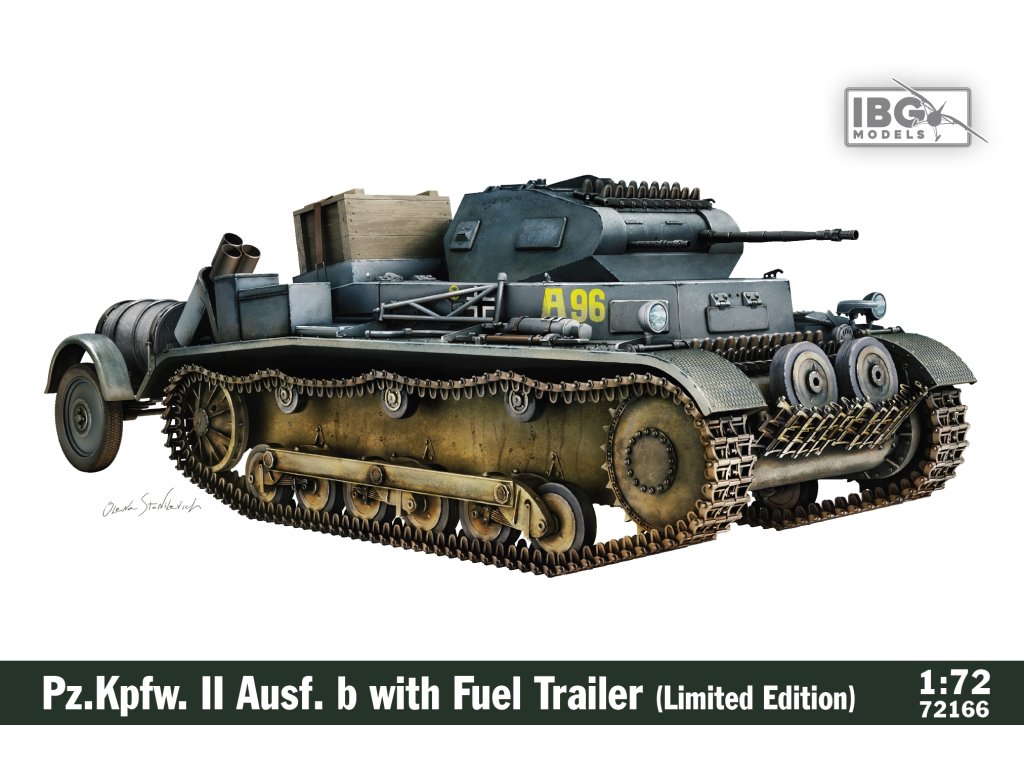 Model Pz.Kpfw. II Ausf. b with Fuel Trailer in 1/72 scale by IBG represents an early version of the German Panzer II light tank, complete with the fuel trailer that used in large-scale mechanized operations at the beginning of World War II. This is a limited edition which includes detailed plastic parts and authentic decals. The package does not include the paint or adhesives needed for assembly.