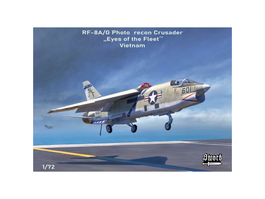 The Vought RF-8A/G Photo-Recon Crusader was an American airborne jet tactical reconnaissance aircraft based on the F-8 Crusader fighter, modified for photographic reconnaissance (camera instead of nose gun). It served in the U.S. Navy and was deployed to rapidly acquire imagery over the coast and inland, typically in Cold War environments including Vietnam. Sword Model SW72154 1/72 scale kit includes masks.