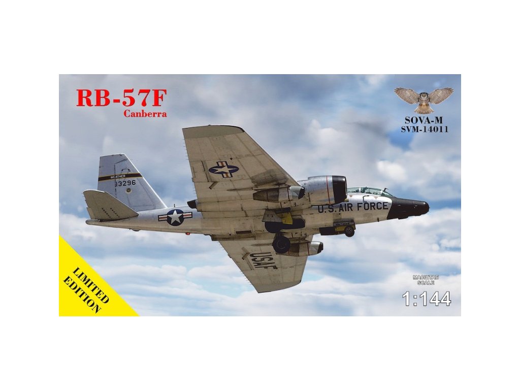 Sova-M RB-57F Canberra 1/144 je stavebnice amerického výškového meteorologického průzkumného letounu z období studené války, zpracovaná v měřítku 1/144 s detailními plastovými díly a obtisky pro dvě kamuflážní schémata. Balení neobsahuje barvy ani lepidla potřebné k sestavení.