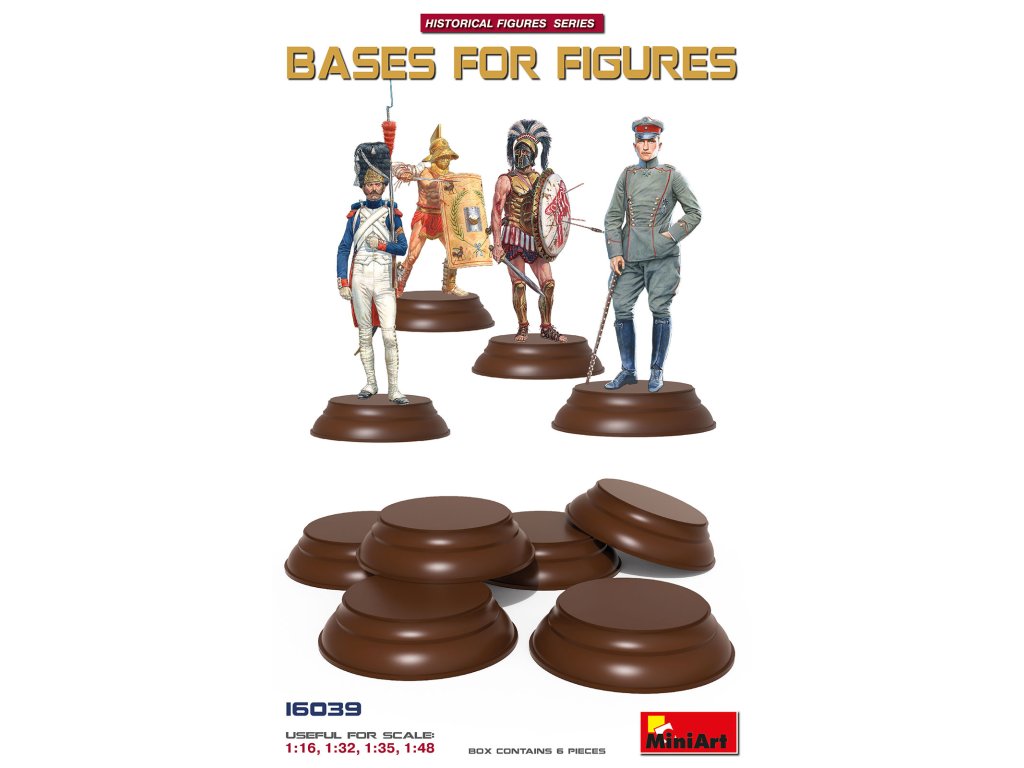MiniArt 1/16 Bases for Figures 6 pc je univerzální sada podstavců určená pro prezentaci figur v měřítku 1/16. Obsahuje šest různě tvarovaných plastových základen, které lze využít jako základ pro civilní i vojenské postavy z různých historických období. Podstavce lze dále upravit nebo doplnit o terénní úpravy, vegetaci či jiné detaily dle vlastního záměru.