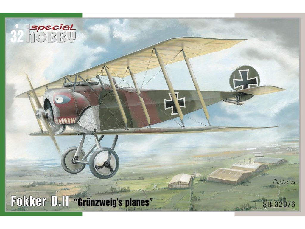 Fokker D.II Grünzweig’s Planes v měřítku 1/32 od Special Hobby představuje raný německý dvouplošný stíhací letoun z první světové války, který byl nasazen na západní frontě v roce 1916. Tento letoun byl obratný, ale kvůli slabšímu motoru rychle zastaral. Model nabízí detailní zpracování motoru, kokpitu a výzbroje a obsahuje označení letadel pilotovaných německým esem Walterem Grünzweigem. Balení neobsahuje barvy ani lepidla potřebná k sestavení.