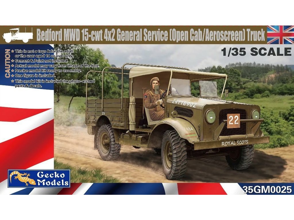 Jedná se o velmi detailní plastikový model v měřítku 1/35 Bedford MWD 15-cwt 4x2, který lze postavit jak ve verzi s otevřenou kabinou nebo s kabinou aeroscreen. Součástí balení je figurka řidiče, leptané díly a obtisky.