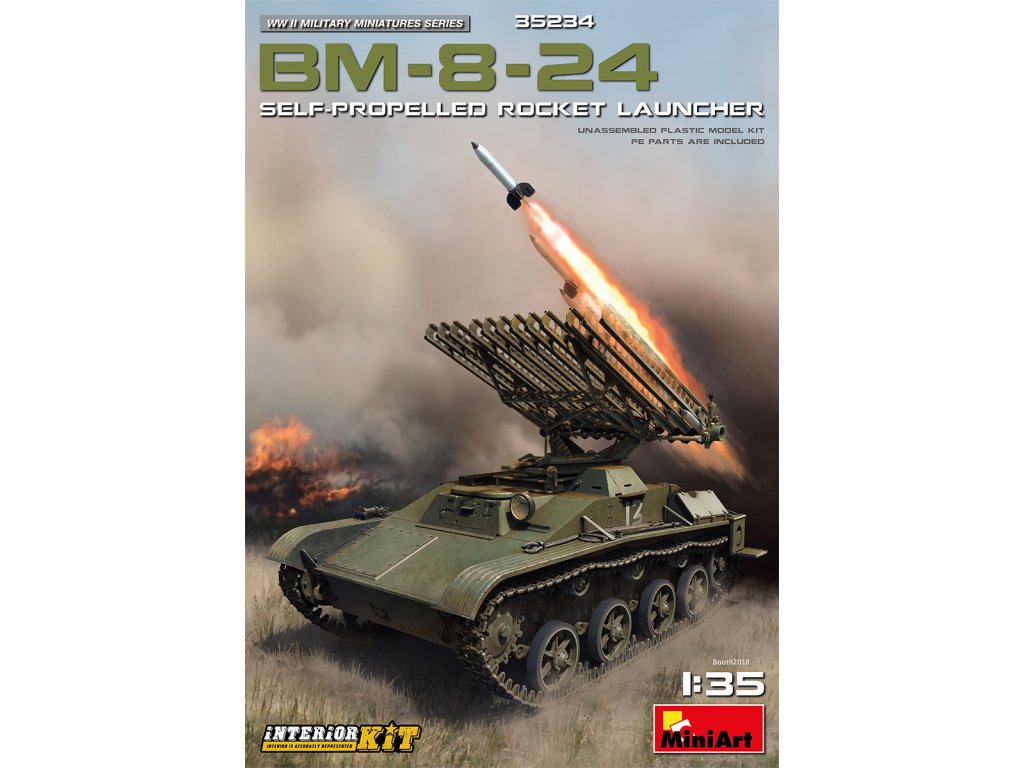 Model BM-8-24 Self-Propelled Rocket Launcher. Interior Kit v měřítku 1/35 od MiniArt představuje sovětské samohybné raketometné vozidlo na podvozku tanku T-60. Stavebnice obsahuje detailní plastové díly s plně ztvárněným interiérem, výzbrojí a raketovou odpalovací soustavou. Balení neobsahuje barvy ani lepidla potřebné k sestavení.