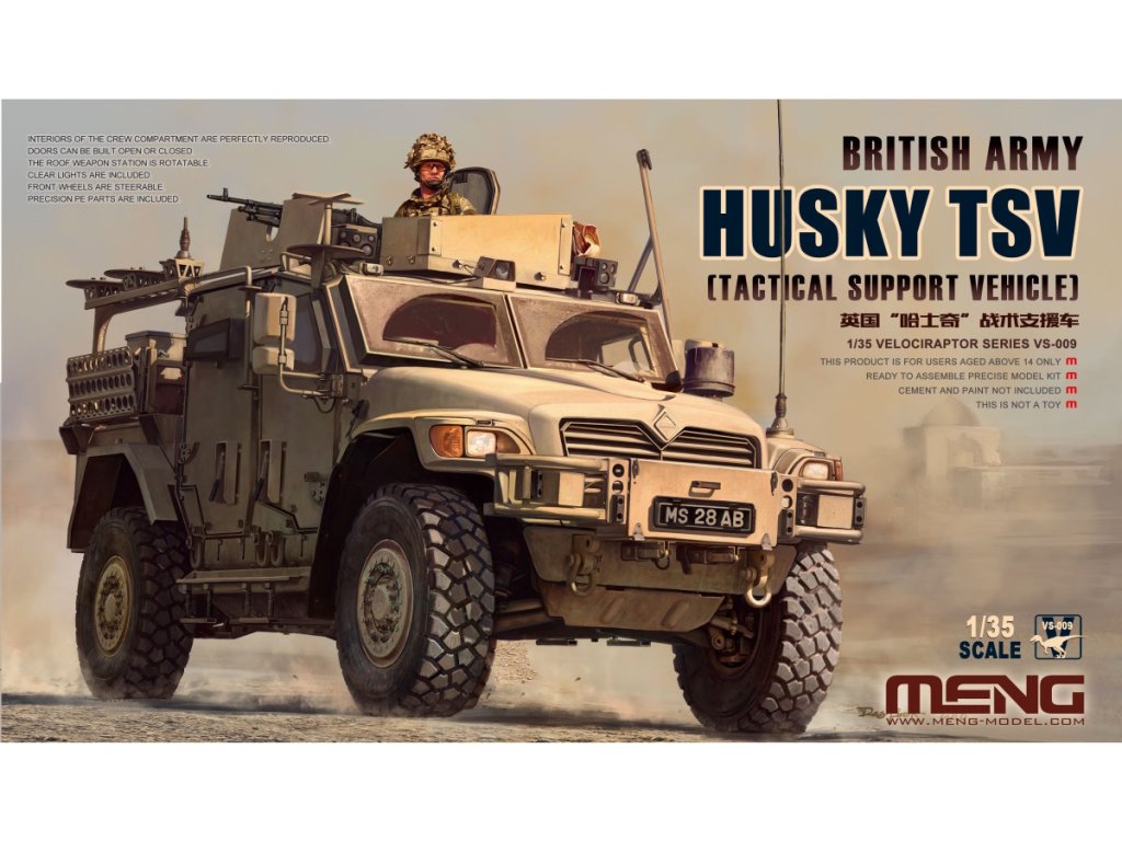 Meng 1/35 British Army Husky TSV (Tactical Support Vehicle) je plastová stavebnice moderního britského obrněného vozidla v měřítku 1/35. Tento lehký taktický stroj byl nasazen v Afghánistánu a Iráku, kde sloužil k průzkumným a podpůrným misím díky vysoké pohyblivosti a ochraně posádky.