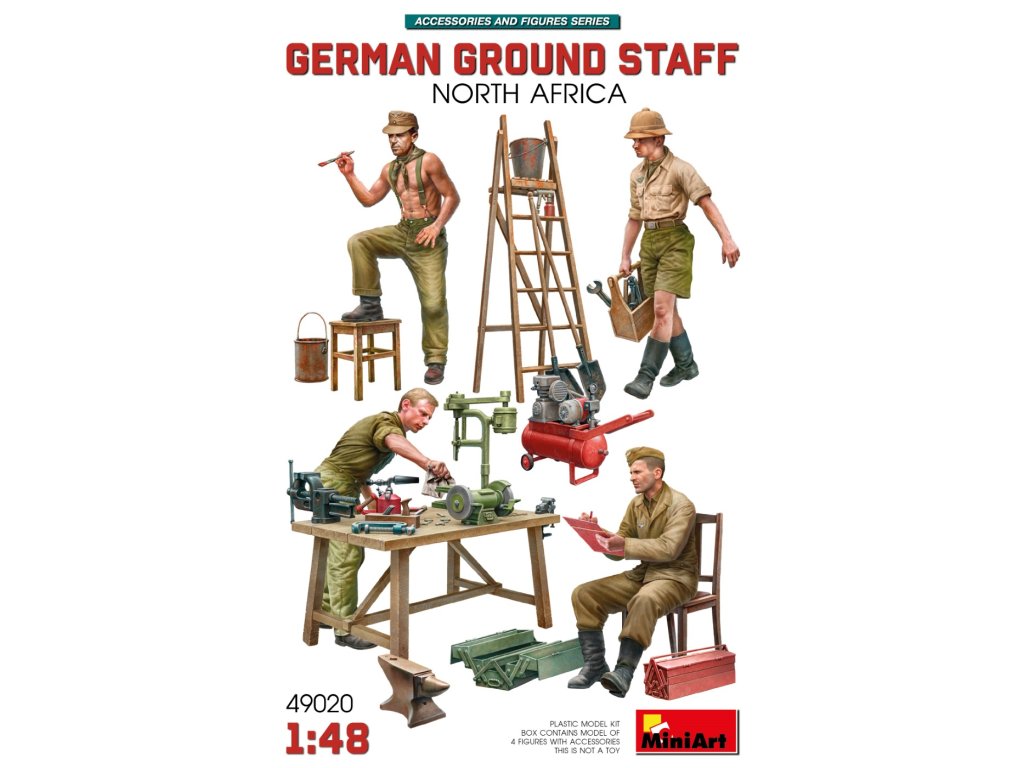 Model German Ground Staff w/Accessories. North Africa v měřítku 1/35 od MiniArt představuje sadu figurek německého pozemního personálu s příslušenstvím z prostředí severoafrického bojiště druhé světové války. Balení neobsahuje barvy ani lepidla potřebné k sestavení.