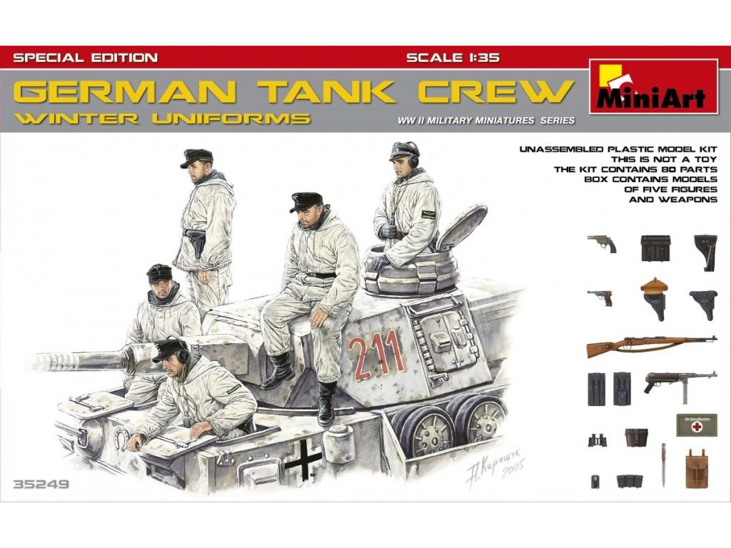 MiniArt přináší ve speciální edici 1/35 German Tank Crew (Winter Uniforms) pět figur německé tankové posádky v zimním vybavení z období druhé světové války. Figurky zachycují tankisty v různých pozicích – od velitelského postavení ve věži až po uvolněné pózy během odpočinku. Oblečení odpovídá reálným zimním uniformám Wehrmachtu, včetně kabátů, čepic a doplňků, jaké byly běžné během zimních operací na východní frontě.