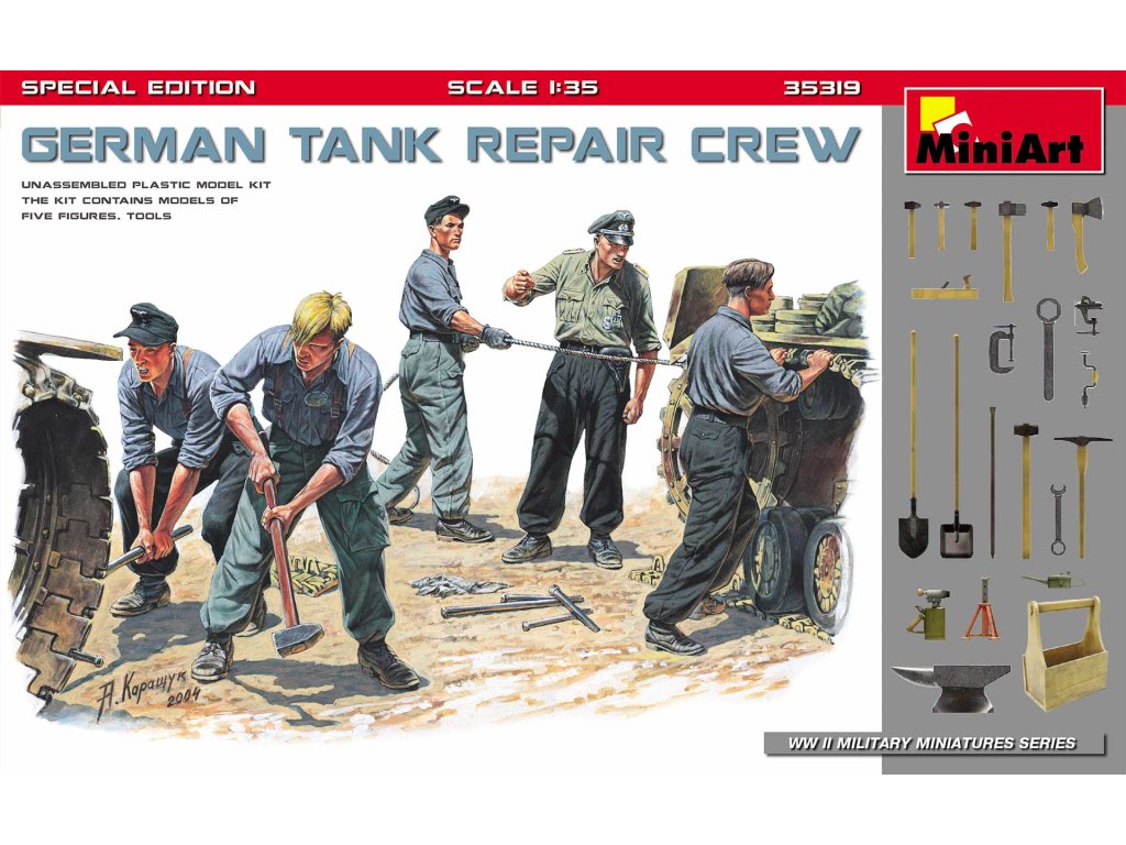 Model German Tank Repair Crew. Special Edition v měřítku 1/35 od MiniArt představuje sadu figurek německých vojáků provádějících opravy obrněné techniky během druhé světové války. Figurky jsou doplněny o nářadí a dílenské vybavení. Balení neobsahuje barvy ani lepidla potřebné k sestavení.