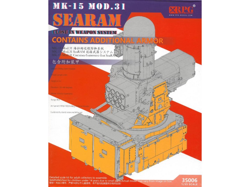 Tato stavebnice amerického námořnictva Mk-15 MOD.31 SeaRAM CIWS s přídavným pancéřováním obsahuje velkoformátové fotoleptané díly pro nejvyšší možnou úroveň detailů.