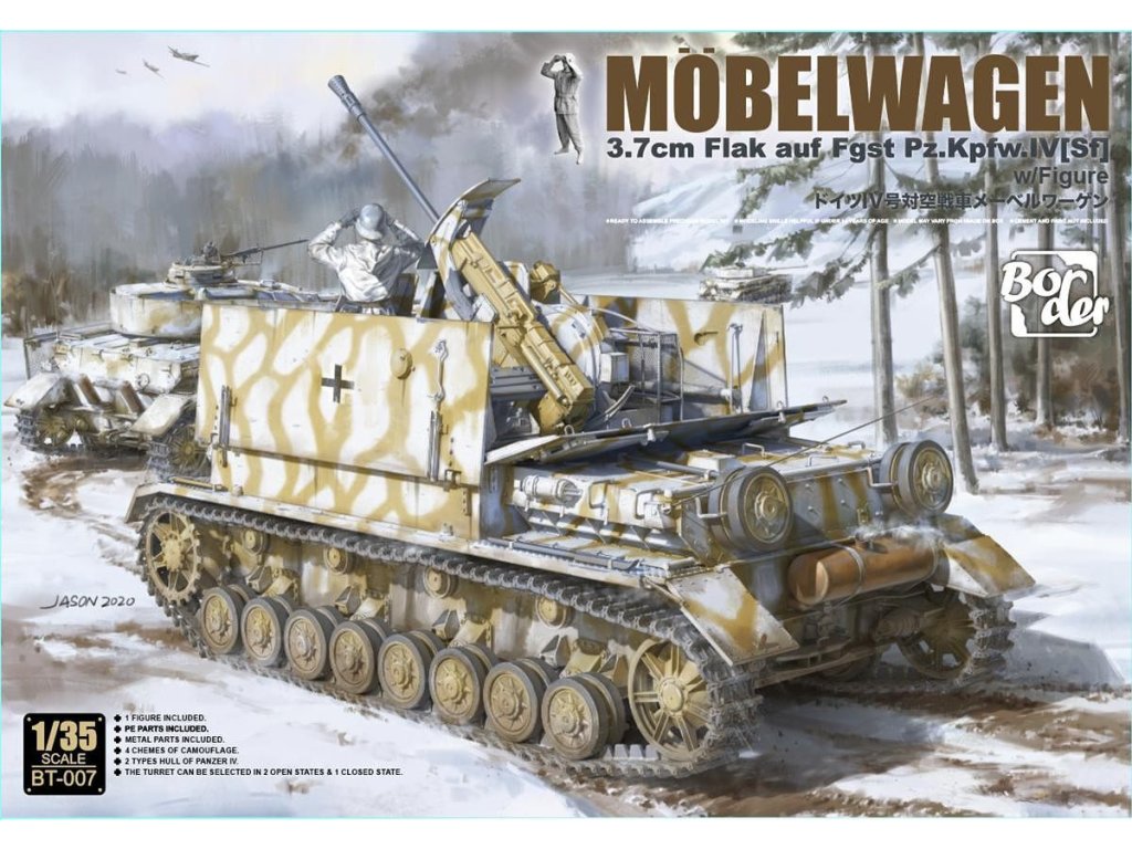 Border Model 1/35 Möbelwagen 3.7cm Flak auf Fgst. Pz.Kpfw. IV (Sf) je model německého samohybného protiletadlového prostředku z konce druhé světové války, vyvinutého na podvozku tanku Panzer IV. Vozidlo neslo 37mm kanón Flak 43 chráněný sklopnými pancéřovými pláty. Balení neobsahuje barvy ani lepidla potřebné k sestavení.