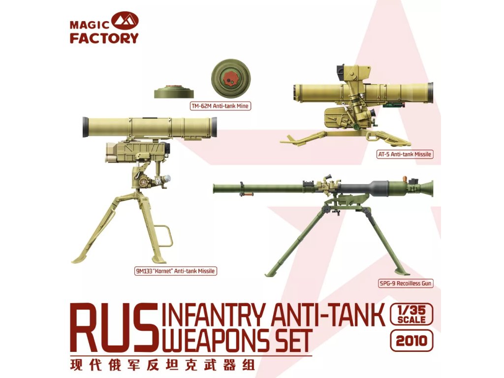 Sada Modern Russian Infantry Anti-tank Weapons Set od Magic Factory v měřítku 1/35 přináší široký výběr moderních protitankových prostředků používaných ruskou pěchotou v posledních desetiletích. Obsahuje realisticky zpracované zbraně, jako jsou přenosné raketomety a řízené střely, které tvoří klíčovou výzbroj pěchotních jednotek v boji proti obrněné technice.