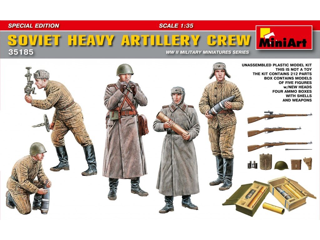 Sada Soviet Heavy Artillery Crew – Special Edition v měřítku 1/35 od firmy MiniArt obsahuje plastové figurky sovětských vojáků obsluhujících těžké dělostřelectvo během druhé světové války. Figurky zachycují obsluhu v akci, včetně nabíjení, míření a komunikace, a jsou doplněny o realisticky ztvárněné uniformy, přilby, brašny, náboje a další výstroj.