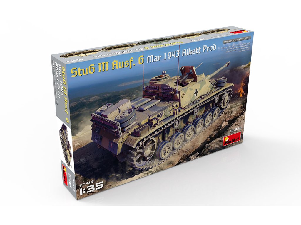 Model 1/35 StuG III Ausf. G Mar 1943 Alkett Prod od MiniArt představuje stíhač tanků německé armády z počátku roku 1943 vyráběný firmou Alkett. Stavebnice nabízí přesně zpracované detaily konkrétní výrobní série. Balení neobsahuje barvy ani lepidla potřebné k sestavení.