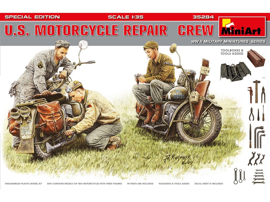 U.S. Motorcycle Repair Crew 1/35 od MiniArt v edici Special Edition zobrazuje americkou opravárenskou četu s motocyklem během druhé světové války. Balení neobsahuje barvy ani lepidla potřebné k sestavení.