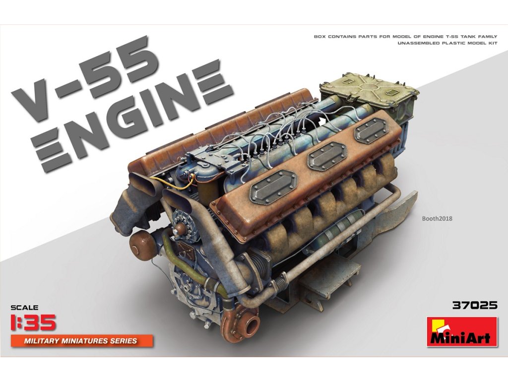 Stavebnice V-55 Engine v měřítku 1/35 od firmy MiniArt přináší samostatný model dvanáctiválcového dieselového motoru V-55, který byl standardně instalován v sovětských tancích řady T-55 a jejich exportních i modernizovaných verzích. Tento výkonný motor o objemu přes 38 litrů tvořil základ spolehlivého pohonu sovětských obrněnců během studené války a byl používán i v některých typech ženijních a speciálních vozidel.