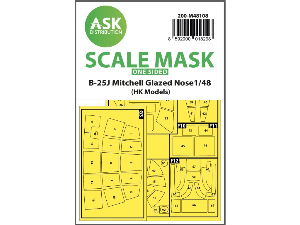 1/48 B-25J Michchell jednostranná samolepící maska čirých dílů a masky kol pro stavebnici HK Model, katalogové číslo 200-M48108. Předřezaná maskovací folie Kabuki nejvyšší kvality, nejlepší technologická výroba průřezu folie. Veškeré díly masek potištěné čísly, které spolu s návodem přesně definují pozici, umístění a aplikaci na maskovaném modelu - velké usnadnění práce vedoucí k dokonalému modelu.