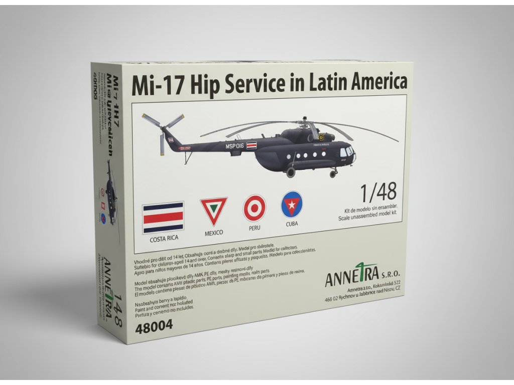 Vzácná limitovaná edice nejmodernějšího modelu Mil Mi-17 Hip v měřítku 1:48 od Annetra, zaměřená na stroje sloužící v Latinské Americe. Tato verze, založená na vynikajících výliscích AMK, je obohacena o díly a obtisky nezbytné pro ztvárnění exotických a barevných schémat zemí jako Kolumbie, Mexiko, Peru a Kuba.