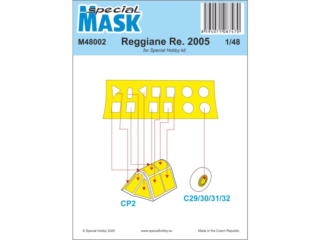 Sada maskovacích šablon pro Reggiane Re.2005 v měřítku 1/48 od Special Hobby umožňuje přesné maskování kabiny a dalších průhledných částí modelu během lakování. Šablony přesně odpovídají tvarům skel, což usnadňuje nanášení barev a zajišťuje ostré linie nátěru. Vyrobeno z kvalitního materiálu, který se snadno aplikuje i odstraňuje. Balení neobsahuje barvy ani lepidla potřebná k sestavení.