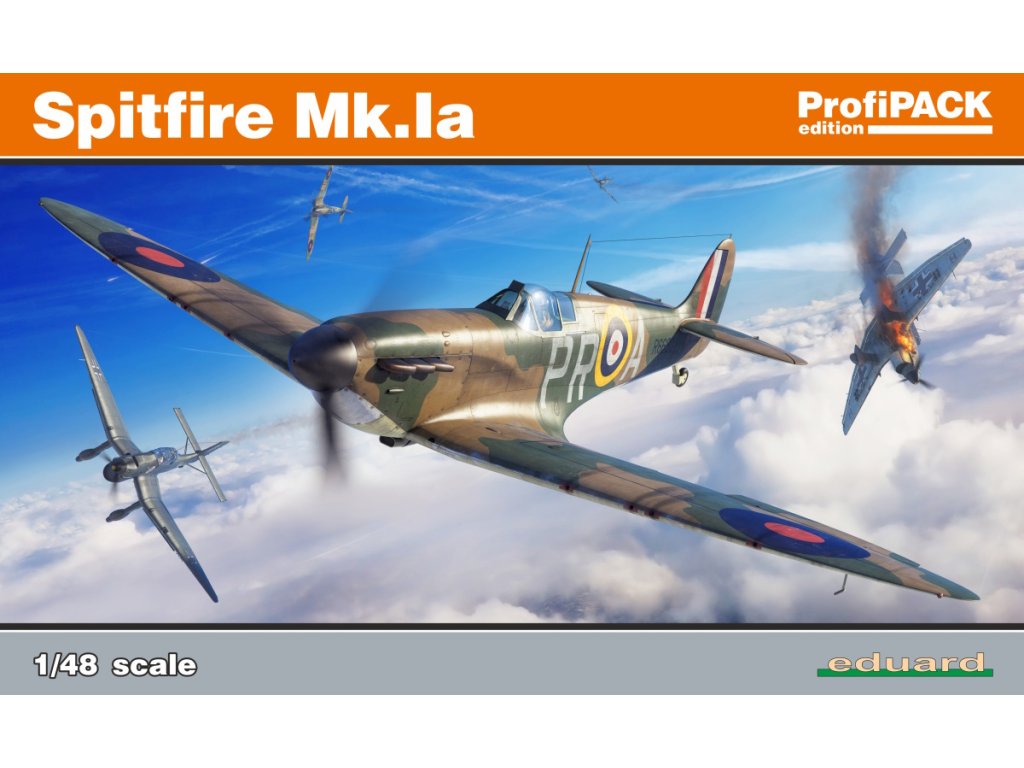 Eduard Spitfire Mk.Ia 1/48 je stavebnice britského stíhacího letounu z období bitvy o Británii, zpracovaná v edici ProfiPACK s detailními plastovými díly, barevnými leptanými doplňky, maskami a sedmi kamuflážními schématy. Balení neobsahuje barvy ani lepidla potřebné k sestavení.