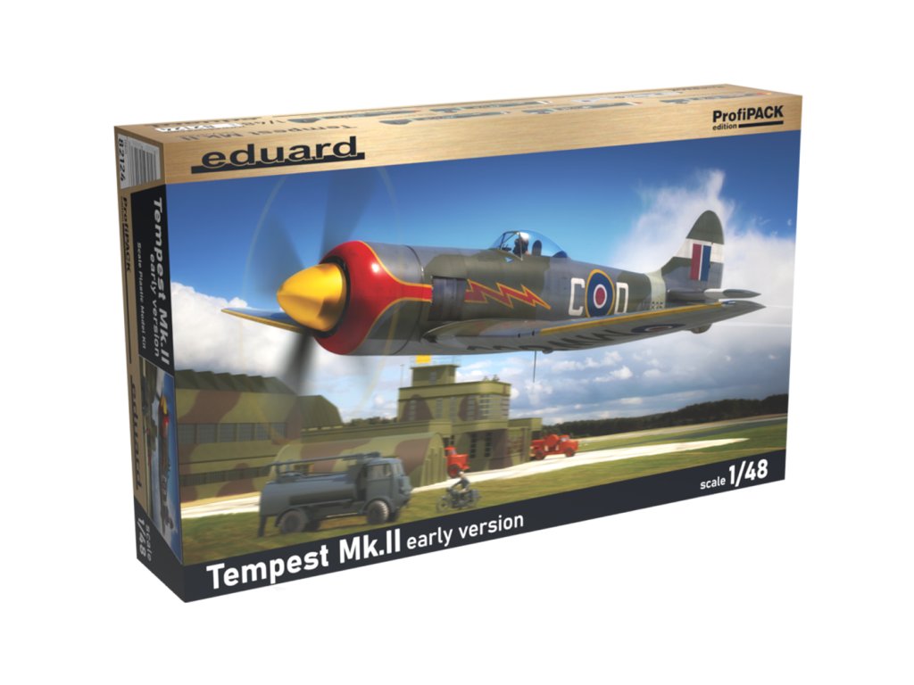 Eduard Tempest Mk.II early version 1/48 je stavebnice britského stíhacího letounu z konce druhé světové války, vybaveného hvězdicovým motorem Bristol Centaurus, v edici ProfiPACK s detailními plastovými díly, barevnými leptanými doplňky, maskami a šesti kamuflážními schématy. Balení neobsahuje barvy ani lepidla potřebné k sestavení.