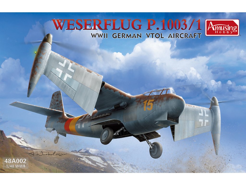 Amusing Hobby 1/48 Weserflug P.1003/1 představuje plastovou stavebnici experimentálního německého letounu z období druhé světové války. Projekt tohoto unikátního VTOL stroje (vertikální vzlet a přistání) vznikl v roce 1939 a měl využívat sklápěcí křídla s pohyblivými gondolami motorů. Přestože nikdy nepřekročil fázi návrhu, stal se ukázkou technické odvahy a snahy Luftwaffe o průlomovou technologii. Stavebnice v měřítku 1/48 nabízí detailní provedení tohoto pozoruhodného konceptu.