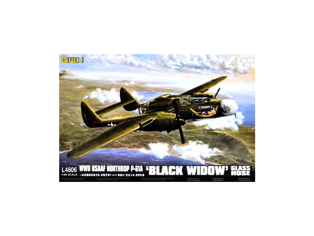 Model Northrop P-61A "Black Widow" Glass Nose v měřítku 1/48 od GWH představuje americký noční stíhací letoun z období druhé světové války, vybavený prosklenou přídí. Stavebnice obsahuje detailně zpracované plastové díly pro exteriér i interiér, včetně realistického kokpitu, radarového vybavení a výzbroje. Součástí jsou také obtisky pro několik verzí kamufláže amerického armádního letectva (USAAF). Balení neobsahuje barvy ani lepidla potřebné k sestavení.