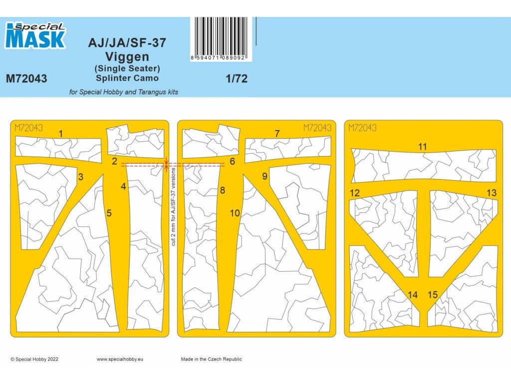 Sada maskovacích šablon pro AJ/JA/SF-37 Viggen (Single Seater) Splinter Camo v měřítku 1/72 od Special Hobby umožňuje přesné maskování kabiny i aplikaci charakteristického „splinter“ kamuflážního schématu švédského letectva. Šablony přesně odpovídají tvarům skel a jednotlivým segmentům kamufláže, což usnadňuje nanášení barev a zajišťuje ostré linie nátěru. Vyrobeno z kvalitního materiálu, který se snadno aplikuje i odstraňuje. Balení neobsahuje barvy ani lepidla potřebná k sestavení.