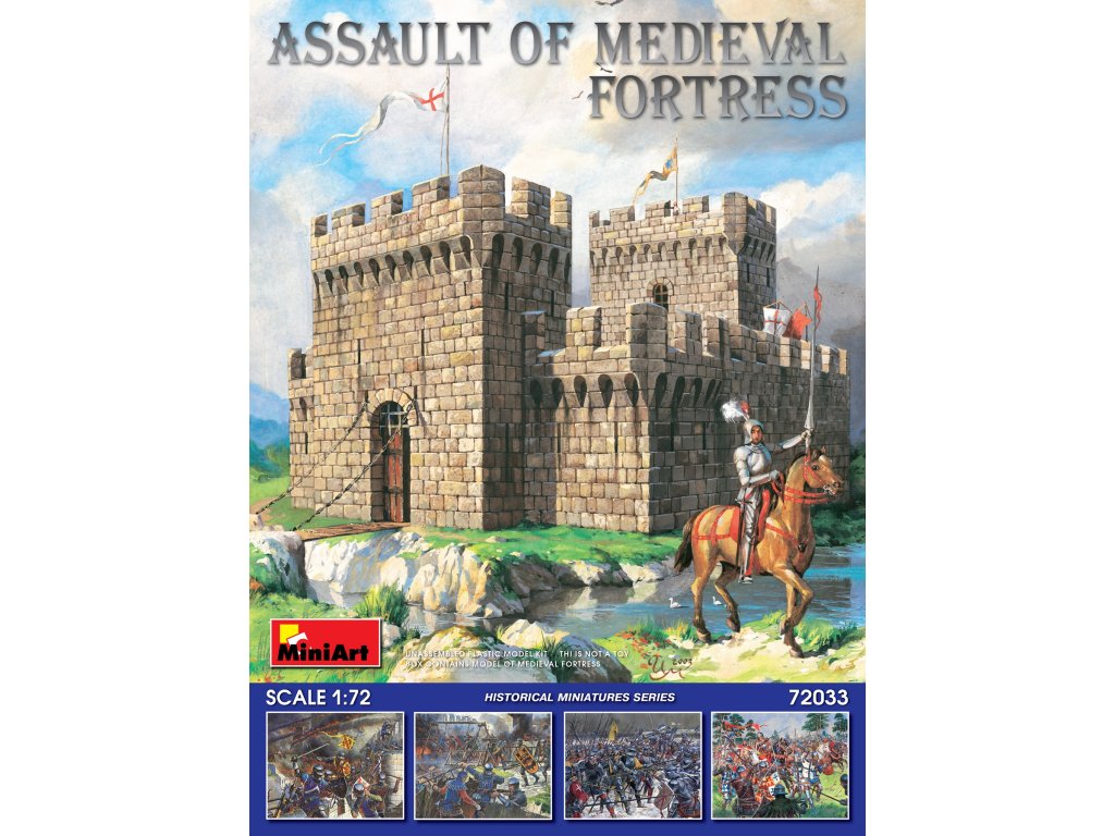 Model 1/72 Assault of Medieval Fortress od MiniArt představuje scénu středověkého obléhání s hradem a sadou figurek útočníků i obránců. Balení neobsahuje barvy ani lepidla potřebné k sestavení.