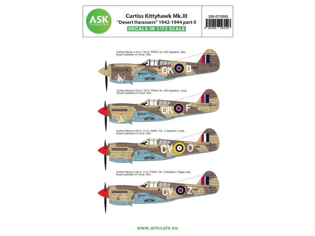 1/48 Curtiss Kittyhawk Mk.III "The Desert Harassers" part II. RAAF - Royal Australian Air Force in North African campaign 1942-1944. Obsahuje 4 markingy.
