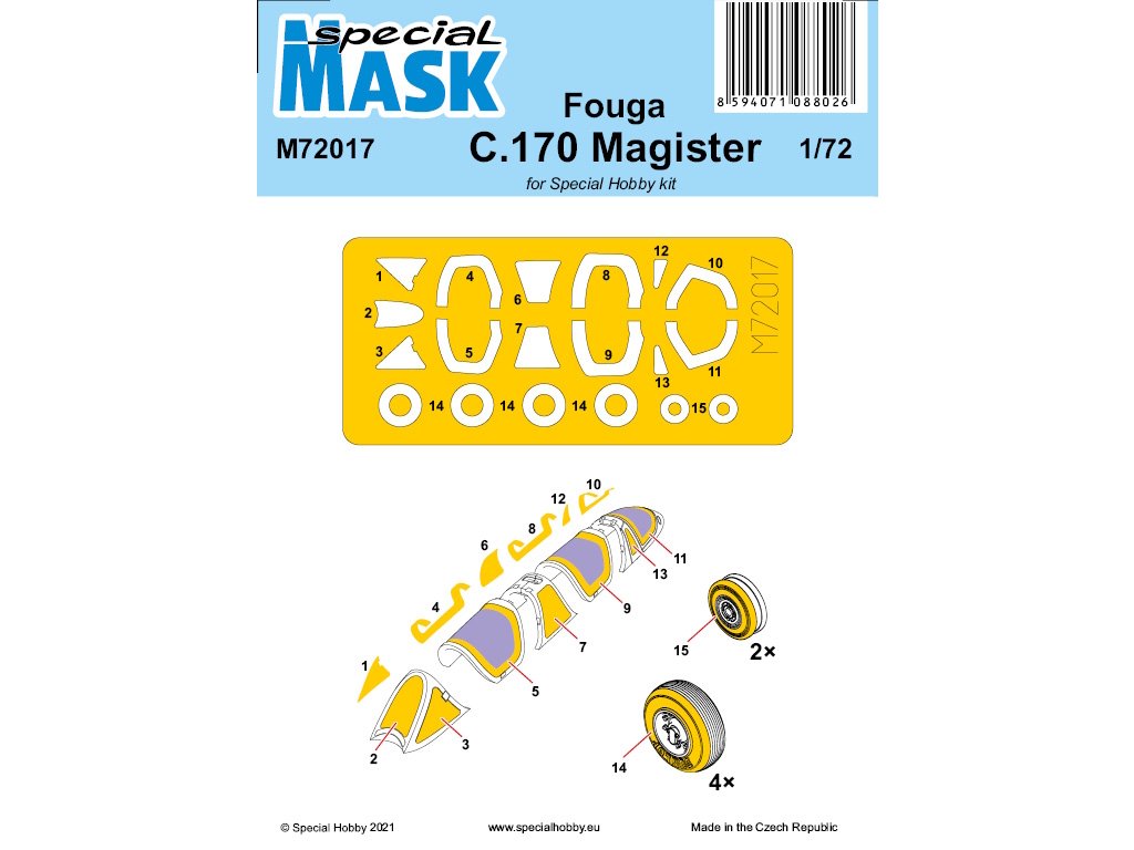 Sada maskovacích šablon pro Fouga C.170 Magister v měřítku 1/72 od Special Hobby umožňuje přesné maskování kabiny a dalších průhledných částí modelu během lakování. Šablony přesně odpovídají tvarům skel, což usnadňuje nanášení barev a zajišťuje ostré linie nátěru. Vyrobeno z kvalitního materiálu, který se snadno aplikuje i odstraňuje. Balení neobsahuje barvy ani lepidla potřebná k sestavení.