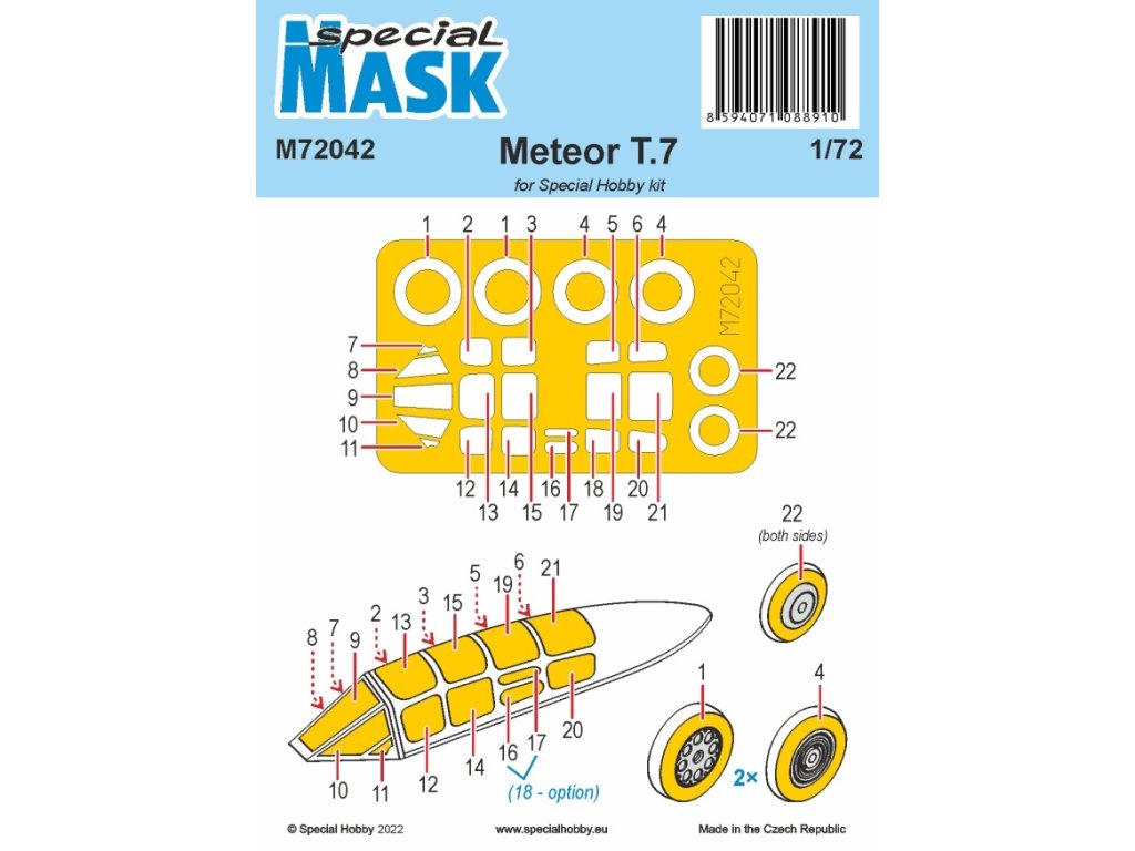 Sada maskovacích šablon pro Gloster Meteor Mk.7 v měřítku 1/72 od Special Hobby umožňuje přesné maskování kabiny a dalších průhledných částí modelu během lakování. Šablony přesně odpovídají tvarům skel, což usnadňuje nanášení barev a zajišťuje ostré linie nátěru. Vyrobeno z kvalitního materiálu, který se snadno aplikuje i odstraňuje. Balení neobsahuje barvy ani lepidla potřebná k sestavení.