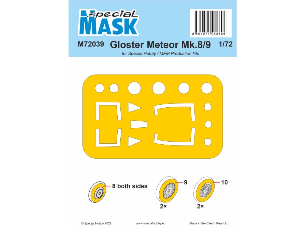 Sada maskovacích šablon pro Gloster Meteor Mk.8/9 v měřítku 1/72 od Special Hobby umožňuje přesné maskování kabiny a dalších průhledných částí modelu během lakování. Šablony přesně odpovídají tvarům skel, což usnadňuje nanášení barev a zajišťuje ostré linie nátěru. Vyrobeno z kvalitního materiálu, který se snadno aplikuje i odstraňuje. Balení neobsahuje barvy ani lepidla potřebná k sestavení.