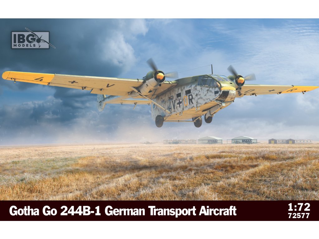 Model Gotha Go 244B-1 v měřítku 1/72 od IBG představuje německé transportní letadlo z druhé světové války, poháněnou verzi původního kluzáku Go 242, určenou pro přepravu nákladu a výsadku. Verze B-1 byla vybavena motory BMW 132Z a sloužila na východní frontě i v oblasti Středomoří. Stavebnice obsahuje detailně zpracované plastové díly a autentické obtisky. Balení neobsahuje barvy ani lepidla potřebné k sestavení.