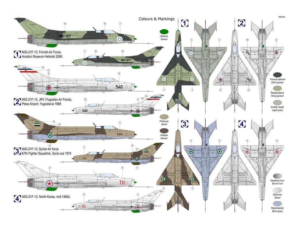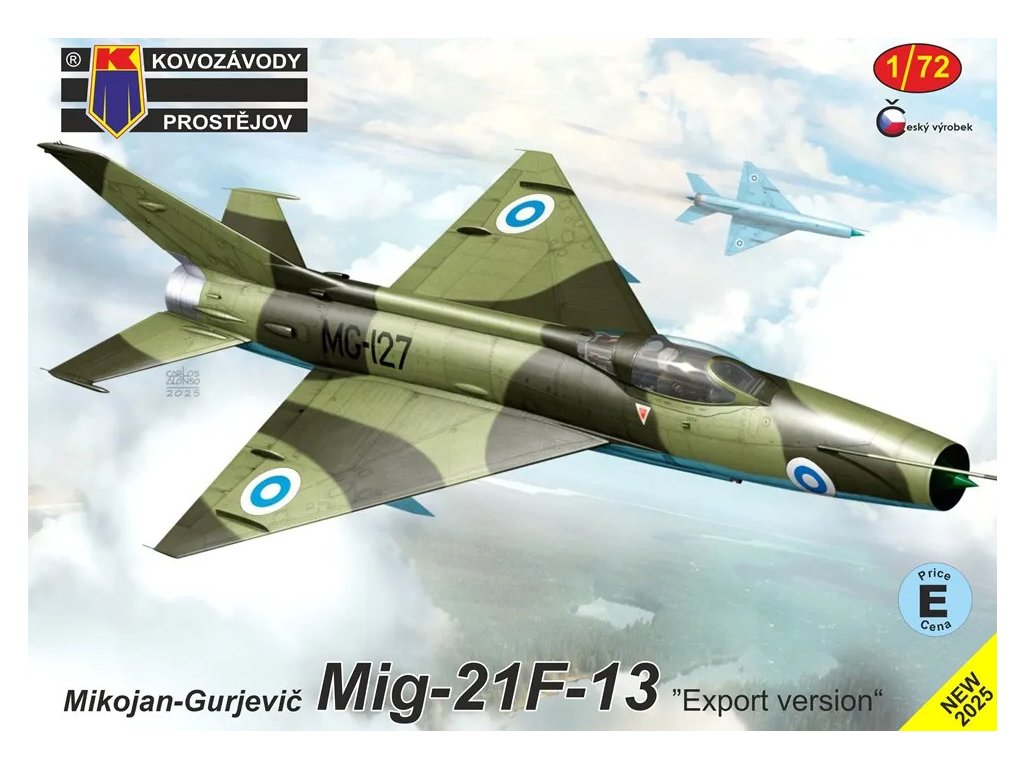 MiG-21F-13 "Export version" 1/72 je stavebnice rané verze sovětského proudového stíhacího letounu určené pro export, v provedení od Kovozávodů Prostějov, s obtisky pro několik zahraničních uživatelů. Balení neobsahuje barvy ani lepidla potřebné k sestavení.