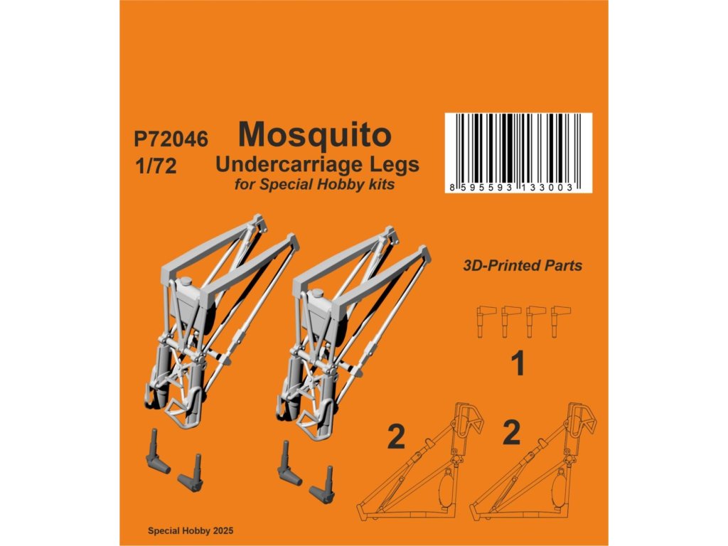 1/72 Mosquito Undercarriage Legs jsou detailní kovové podvozkové nohy určené pro stavebnice Mosquita od Special Hobby. Poskytují vyšší pevnost a odolnost oproti plastovým dílům.