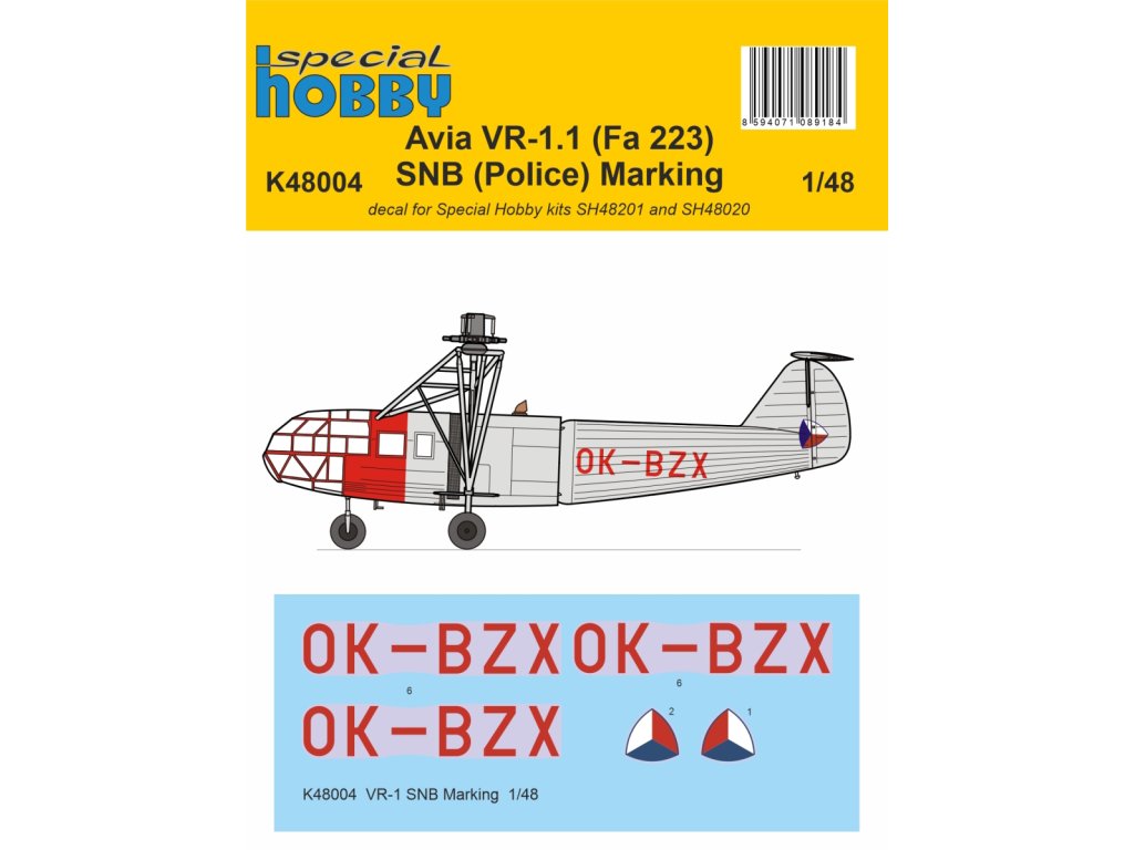 Sada obtisků pro historicky první kus vrtulníku VR-1, což byl FA 223 vyráběný v Československu po druhé světové válce. Tento vrtulník byl zařazen do služby letectva SNB (policejního letectva) a stal se prvním vrtulníkem na světě použitým k řízení dopravy. Obtisky jsou vhodné pro stavebnice Special Hobby FA 223 (kódy SH48020 a SH48201).