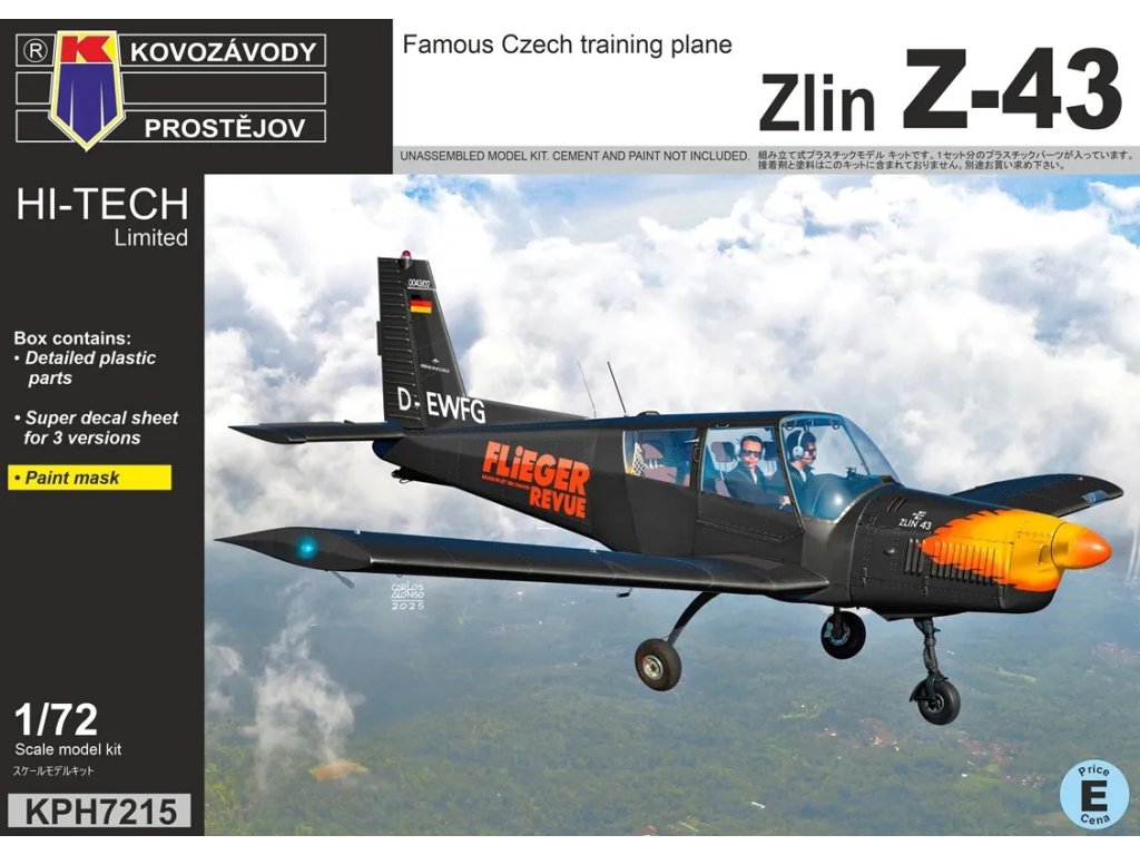 KPM 1/72 Z-43 představuje model československého lehkého sportovního a užitkového letounu z konce 60. let v měřítku 1/72. Zlín Z-43 vznikl jako čtyřmístná verze osvědčené řady Trenér a dodnes slouží v aeroklubech i soukromém sektoru. Stavebnice v edici KPH obsahuje obtisky, malovací masky a 3D tištěné díly.