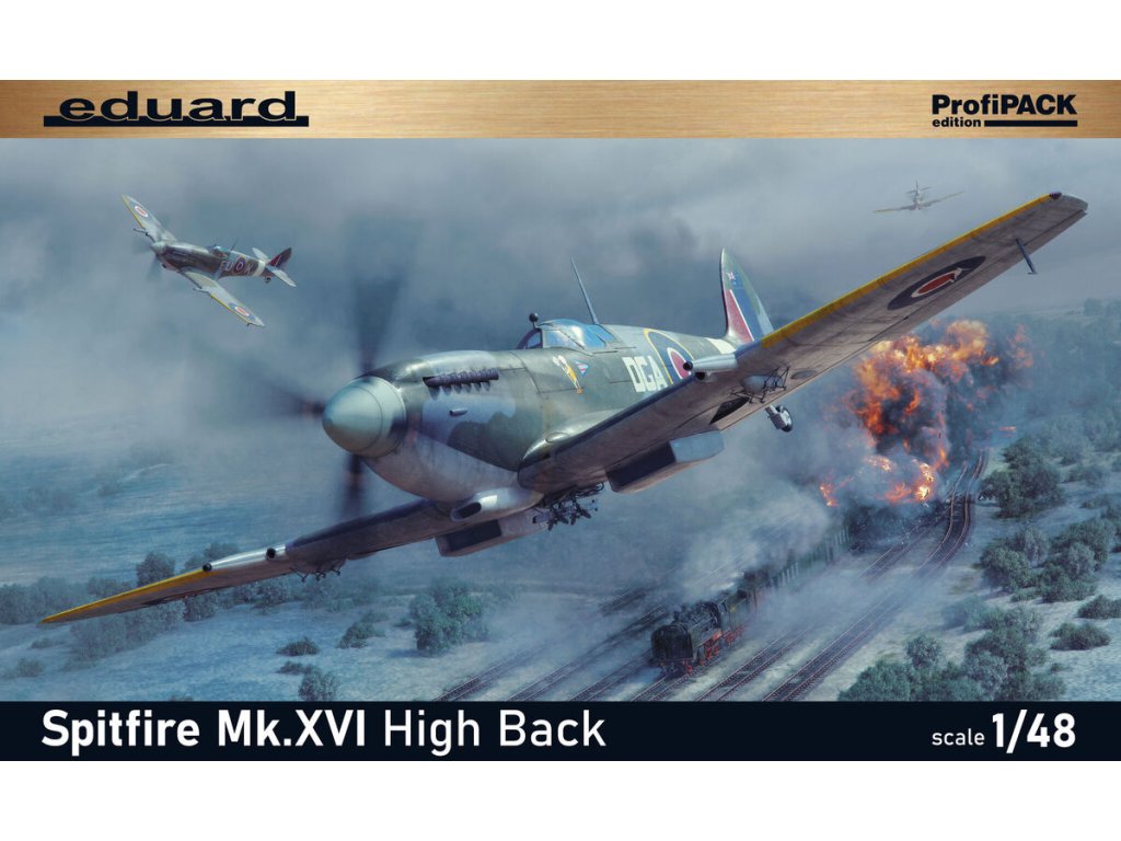 Eduard Spitfire Mk.XVI High Back 1/48 je stavebnice britského stíhacího letounu z konce druhé světové války, zpracovaná v edici ProfiPACK s detailními plastovými díly, barevnými leptanými doplňky, maskami a obtisky pro šest kamuflážních schémat. Balení neobsahuje barvy ani lepidla potřebné k sestavení.